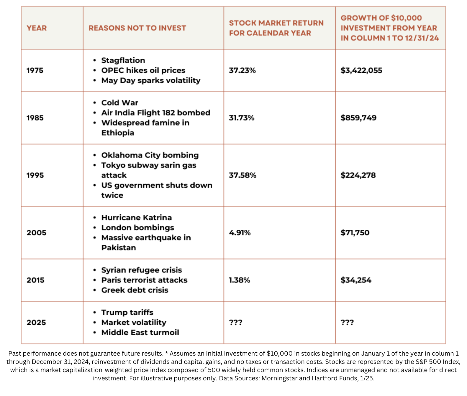 Even in turbulent years, markets have rebounded. The table below shows examples from each year ending in “5”—a nod to where we are now, in 2025.